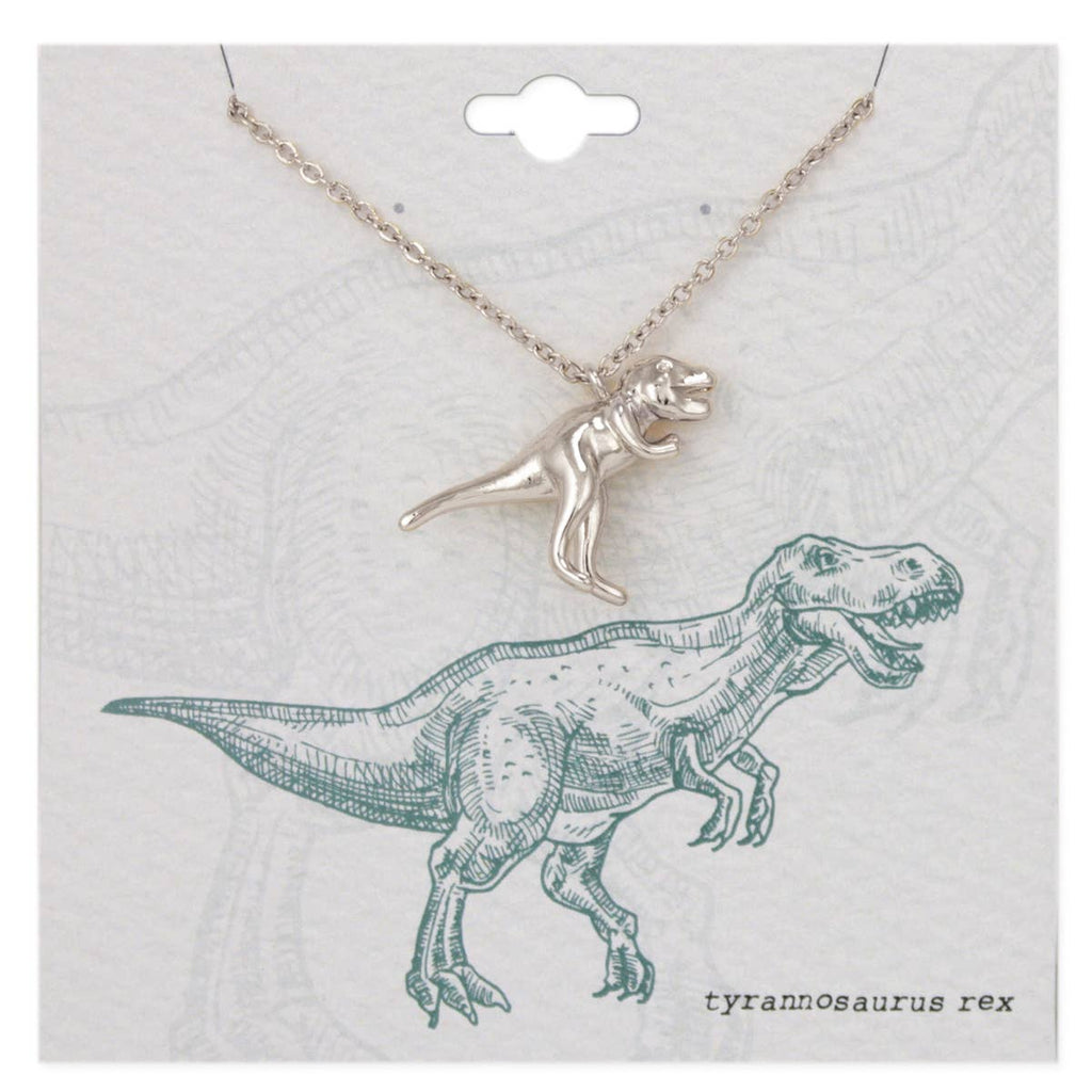 Channel Jurassic charm with this silver Tyrannosaurus rex necklace. This adorable silver dino pendant on link chain is perfect for adding a playful touch to any outfit. The smooth shiny silver t-rex design makes for a modern prehistoric statement. Ideal for anyone who loves a bit of whimsy and a lot of fun in their accessories. Get ready to stomp into style! • Made in China • Silver Tyrannosaurus rex necklace • Prehistoric inspired dino necklace in silver • Materials: Silver Tone Metal • Measurements: 16-18" long, 1 x 1" pendant • Closure: Lobster Clasp