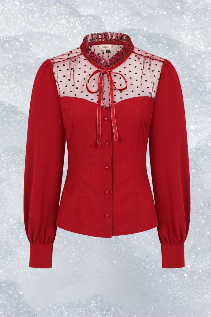 A special 1950's inspired woven blouse with frill neck detail and satin ribbon tie closure.