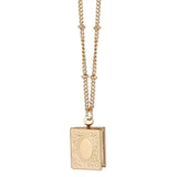 Keep your secrets safe in this gold book locket necklace. Gold bead and chain necklace features vintage style book locket. Perfect gift for book lovers! * Made in China * Bright gold book locket necklace * Vintage inspired literature design * Includes adjusting links * Measures: 20-22"; 1/2" * Materials: Gold Tone Metal * Closure: Lobster Clasp